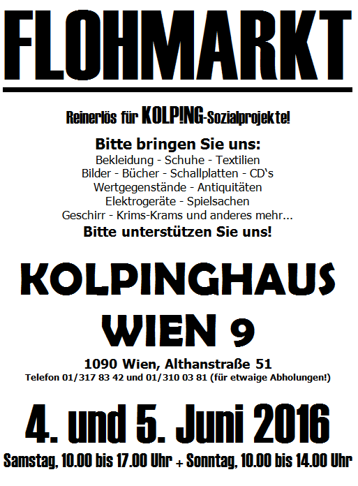 Die Kolpingsfamilie Wien-Alsergrund lädt am 4. und 5. Juni 2016 zum traditionellen Flohmarkt im Kolpinghaus ein.