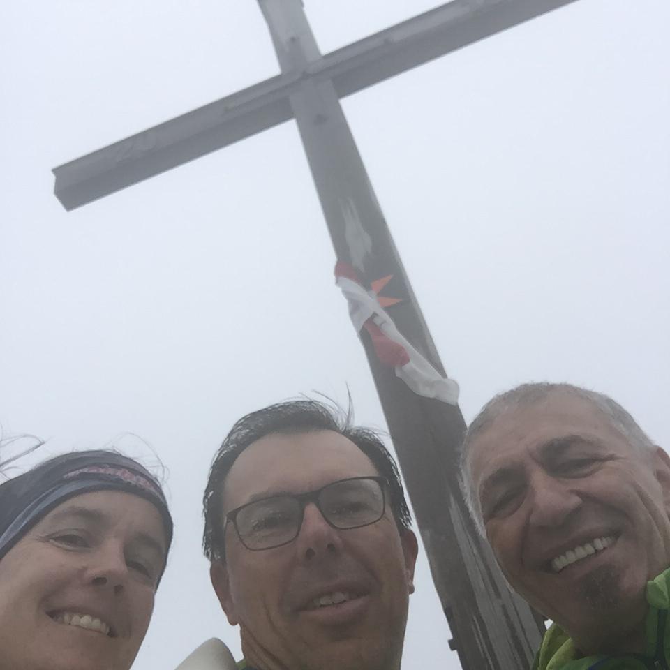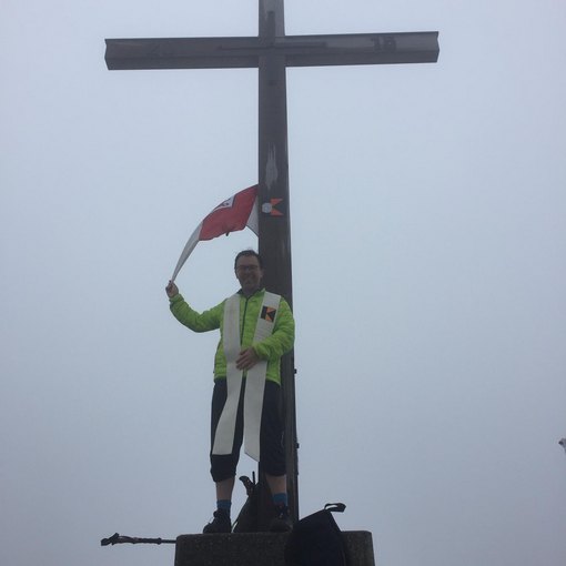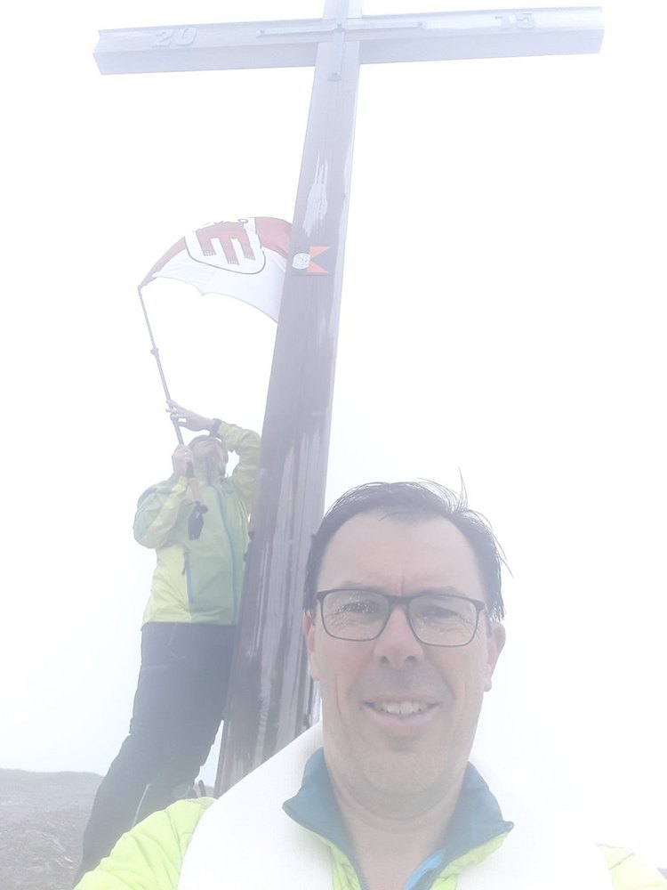 Das neue Kreuz weist eine Größe von 5,50 Metern auf. Am 6. September sollte es im Rahmen einer Bergmesse feierlich eingeweiht werden. „Die Gipfelmesse ist aber ins Wasser gefallen“, berichtet Präses Rainer Büchel, der es sich nicht nehmen ließ, trotz Schlechtwetters eine Segensfeier im kleinen Kreise abzuhalten – inklusive Selfie.